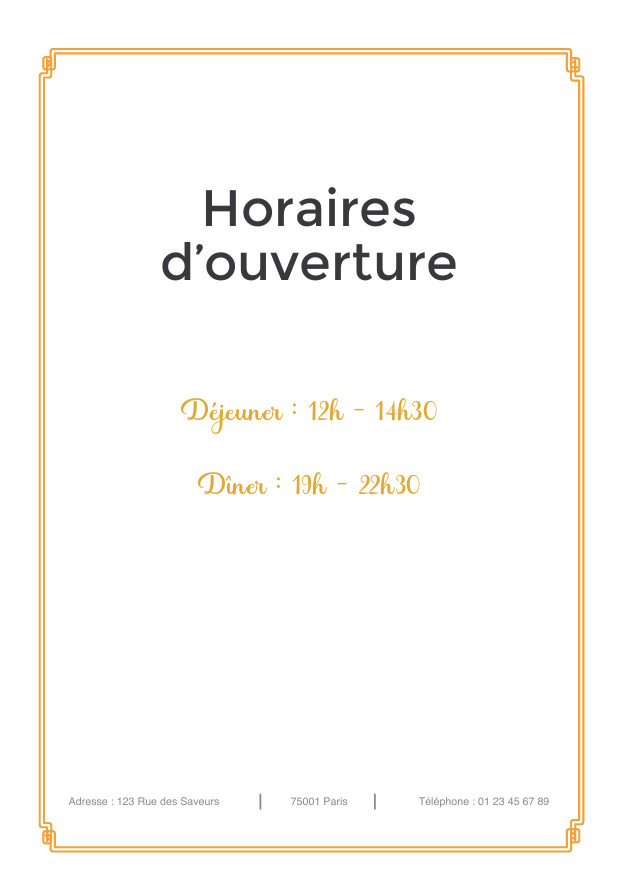Le titre "Horaires d’ouverture" est affiché en noir, suivi des informations horaires en jaune, dans une taille réduite.