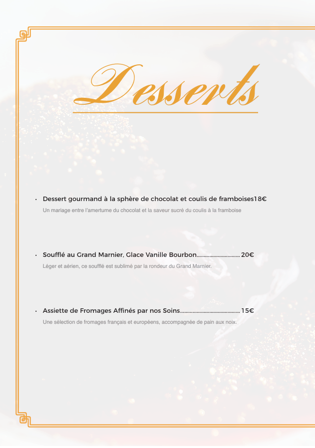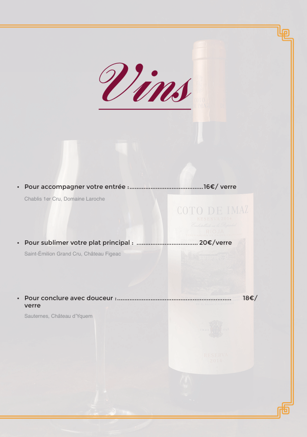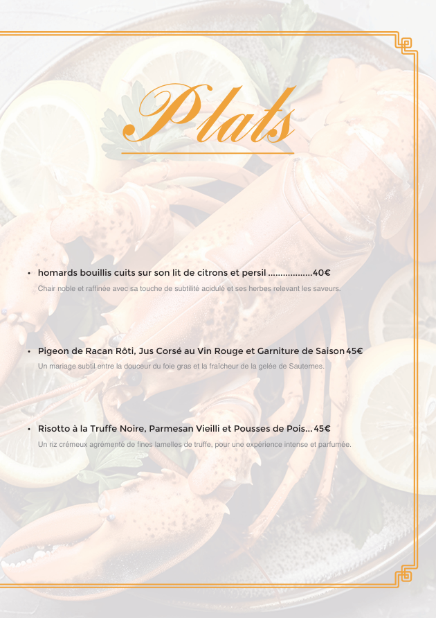 Le client souhaite que chaque page du menu soit illustrée en arrière-plan par un ou plusieurs visuels de plats correspondant au contenu présenté. Ces visuels, ainsi que les textes rédactionnels, sont fournis par le client.
