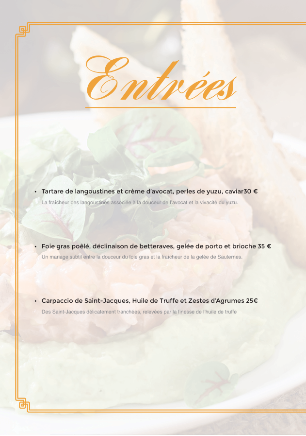 Le client est un restaurant étoilé souhaitant actualiser sa carte, estimant que celle-ci ne reflète plus suffisamment le standing et le raffinement de son établissement. Cette initiative s’inscrit dans une volonté affirmée de rester à la pointe des tendances gastronomiques, afin de renforcer sa crédibilité et de répondre aux attentes d’une clientèle exigeante.