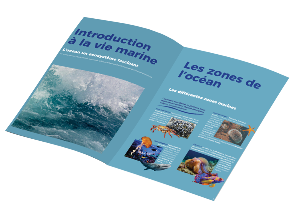 L’objectif est d’expliquer aux élèves les rôles essentiels des océans, d’aborder les menaces telles que la pollution, la surpêche et le dérèglement climatique, puis de partager des gestes simples pour protéger nos environnements marins au quotidien.